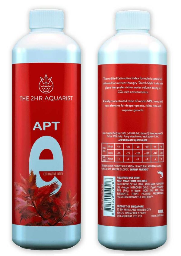 2Hr Aquarist APT Estimative Index With the 2HR AQUARIST APT ESTIMATIVE INDEX, the famous nutrient dosing approach pioneered by Tom Barr is now available in a ready-to-use concentrate that removes the guesswork from trying to recreate this powerful and sometimes elusive formula. The key here is the concentrate of this formula. Just 5ML per 100 liters adds the following nutrients 6 PPM Nitrogen 1.5 PPM Phosphorus 6 PPM Potassium 0.16 PPM Iron And additional amount of Boron Copper Manganese Magnesium Molybdenum & Zinc Dosage: Dose 5ml per 100L 3 times per week or 2ml per 100L daily The 2Hr Aquarist All-In-One Fertiliser. Richer Colors, Less Algae. Faster Results. FAQ Here . Click here for other 2Hr Aquarist Product Ranges Click her for more information about Product With the 2HR Aquarist APT EI, the famous nutrient dosing approach pioneered by Tom Barr is now available in a ready-to-use concentrate that removes the guesswork from trying to recreate this powerful and sometimes elusive formula. An overview of the EI methodology can be found here .