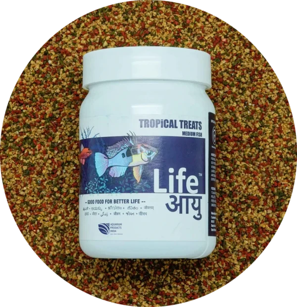 + Free ShippingLife Aayu Food Tropical Treats – Medium Fish Immunity Booster Handmade Natural Source Ayurvedic Ingredients Clinically Proven Content Ingredients: Fish Meal, Anchovies, Shrimp Meal, Yeast Extract, Wheat Extract, Soy Protein Isolate, Fish Oil, Whole Eggs, Vitamin E Supplement, Vitamin B12 Complex, Vitamin a, Coated and Stabilised Vitamin C, Cod Liver Oil, Vegetable Oil, Permitted Grade a Preservatives and Antioxidants, Asthaxanthin, Paprika, Lutein 10%, Spirulina, Sea Weed Extract, Garlic Extract, Moringa Total cart value should be above Rs. 380 to avail free shipping for this product else Rs. 65/- will be shipping cost if order value is below 380/-