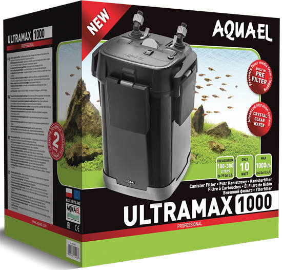 AQUAEL External Filter Ultramax 1000 is a professional external filter for aquaria up to 300 litres . The modern external filter convinces with its large filter volume and compact design. With a height of only 40 cm, it fits into any cabinet. Thanks to its high-quality workmanship, the AQUAEL Ultramax 1000 is extremely reliable and almost noiseless in operation. The energy-saving pump has a costly pump capacity of 1,000 l/h and a power consumption of only 10 watts. As we are accustomed to from AQUAEL, this aquarium filter also has a lot of useful details which are not only useful for setup but also for maintenance. For example, with AQUAEL Ultramax you can clean the pre-filter without removing the pump head of the filter. To access the prefilter, simply open a flap on the pump head. This can be done quickly with a few handles. Neither the pump head itself nor the tubes need to be removed. There are also other useful details, such as rotatable hose adapters and an efficient self-priming mechanism. The three filter baskets can be filled individually with any filter material. Of course, the external filter comes already filled with filter material and ready for connection to you. AQUAEL external filter Ultramax 1000 + comfortable, modern external filter for aquariums from 100-300 litres + large filter volume for best cleaning performance + prefilter integrated in the pump head + prefilter easily accessible, without disassembly of the pump head + efficient self-priming mechanism for simple and quick start-up + use of filter media of any kind + filter baskets with large volume + adaptation of the flow rate to the conditions in the aquarium + modern, energy-saving pump + whisper-quiet operation due to high-quality workmanship and use of modern components, e.g. ceramic shaft for the rotor + integrated double shut-off valve – facilitates maintenance + rotatable hose connections for easy installation of the hoses + complete and ready for connection with mechanical and biological filter media + produced in Europe Technical data AQUAEL External Filter Ultramax 1000 for aquariums of approx. 100 to 300 L Pump capacity: 1,000 l/h Flow rate adjustable Pump head: 190 cm Power consumption 230 V/50 Hz, 15 W Container volume: 11 L Basket volume: 1.9 L Number of filter baskets: 3 Tube size: 16/22 Length of contained tubes: 2x 1.5 m Dimensions: 27 x 29 x 40 cm including filter media, mechanical and biological comprehensive installation material suitable for fresh and marine water Warranty : 2 Years Manufacturer Warranty Brochure AQUAEL External Filter Ultramax 1000 Manual AQUAEL External Filter Ultramax 1000 Manual AQUAEL External Filter Ultramax 1000