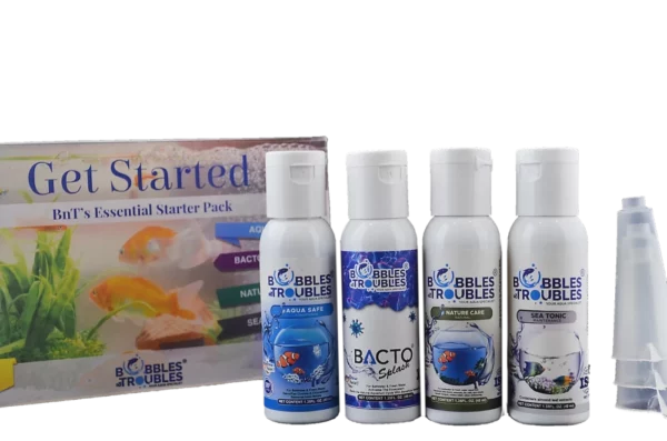 Bubbles N Troubles Essentials Starter Kit consist of 4 products as below: 1) Aqua Safe 40ml 2) BactoSplah 40ml 3) Nature Care 40ml 4) Sea Tonic 40ml Plus there is a 10ml Measuring flask in the box to help our beginner and young hobbyist to measure exact volume for dosage in their tanks. KEEP OUT OF REACH OF CHILDRENS For AQUARIUM USE ONLY MADE IN INDIA