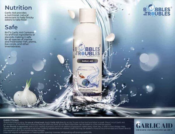 Bubbles N Troubles Garlic Aid consists solely of the extracts from Raw Garlic. Garlic has long been believed by many to have medicinal properties, and clinical research is beginning to support some of the claims made. Garlic Aid provides a nutritional, natural attractant to help finicky eaters to take food. Our research has shown that many fish are attracted to natural odors, such as garlic. Contains no artificial ingredients or steroids. DIRECTIONS: Shake well before using. To use as a food soak: Apply Garlic Aid directly on dry, frozen or live food and allow to soak. Place food in a clean container such as a small bowl or cup and add only enough GARLIC AID to saturate. Allow at least 5 minutes to elapse before feeding, enabling adequate time for the product to become thoroughly absorbed by the food. Liquid food suspensions may be fortified by adding 1.0 ml (approximately 8 drops) Garlic Power per 10 ml of food suspension; stir to mix and allow 5 minutes to elapse before feeding. Maximum benefit of any liquid food suspension is achieved when the food is target-fed to the intended organisms. In due course of time, the dosage may be increased by 50% if so desired as long as water quality is monitored and maintained to within the required ranges. Observe water quality carefully at all times, making adjustments as needed. To use directly in aquarium: Add 5 ml (1 capful) of product per 50 US-gallons of aquarium water every other day, or add ½ that dosage daily. Observe water quality carefully at all times, making adjustments as needed. Garlic Aid may be added to food as recommended and dosed directly into aquarium at ½ the recommended dosage. No medicinal claims are made for Garlic Aid, however fishes showing signs of ectoparasites may benefit from the addition of garlic to their diet. If ectoparasites are present, Garlic Aid may be added to food as recommended and dosed directly into aquarium at ½ the recommended dosage. It is generally recommended that Garlic Aid be utilized either as a means of fortifying prepared food or to provide benefit by direct addition to the water, but not both except as noted above. Does not require refrigeration or freezing after opening, however refrigerating will prolong useful life. Garlic is safe for all species of marine and freshwater fish, plants, live corals, and other invertebrates. DO NOT OVERDOSE OTHER THEN SPECIFIED ABOVE KEEP OUT OF REACH OF CHILDREN Non-Toxic To Humans, Pets & Aquatic Life For Ornamental pond and aquarium fish use only. Not for human consumption.