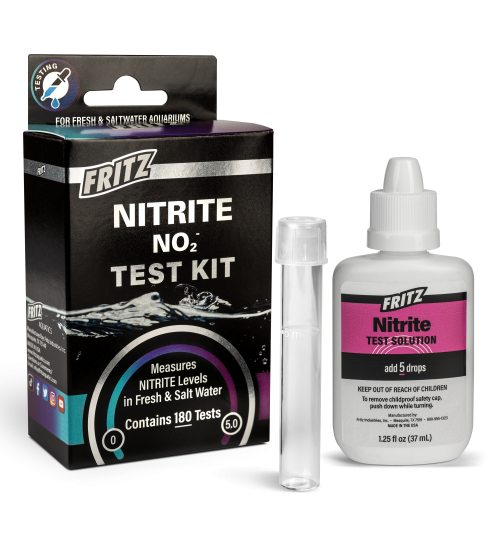 Fritz Liquid Test Kits – Nitrite Nitrite is produced continually during the ammonia cycle by nitrifying bacteria in the biological filter. While not as immediately toxic as ammonia, any accumulation of nitrite should still be addressed as soon as possible. The nitrite level will eventually be broken down to non-toxic nitrate. Regular testing for nitrite is recommended – chronic exposure to even low levels of nitrite can cause brown blood disease in fish, which can cause suffocation and death. With the exception of a system establishing a biological filter and progressing through the nitrogen cycle, the nitrite level in any tank should ideally be zero. Directions & Dosage To remove childproof safety cap, push down while turning. Fill a clean test tube with 5 ml of water to be tested (to the line on the tube). Add 5 drops from Nitrite Test Solution, holding dropper bottle upside down in a completely vertical position to ensure uniformity of drops added to the water sample. Cap the test tube and gently shake several times to mix solution. Attention! Always use the cap. Avoid skin contact as this may affect the test results. Wait five minutes for the color to develop. Read the test results by matching the color of the solution against those on the Nitrite Test Color Chart. To reduce nitrite: reduce feeding, perform partial water changes, add Fritz Complete water conditioner to neutralize any nitrite present, and add FritzZyme nitrifying bacteria. In new aquariums, the nitrogen cycle commonly stalls when phosphate is limited and nitrite stop being converted to nitrate. If nitrite levels do not reduce, check the phosphate level with a Fritz Phosphate Test Kit. Typically, the addition of a phosphate supplement, phosphate-rich fish foods, or a water change with dechlorinated tap water will allow nitrifying bacteria to resume conversion of nitrite to nitrate.